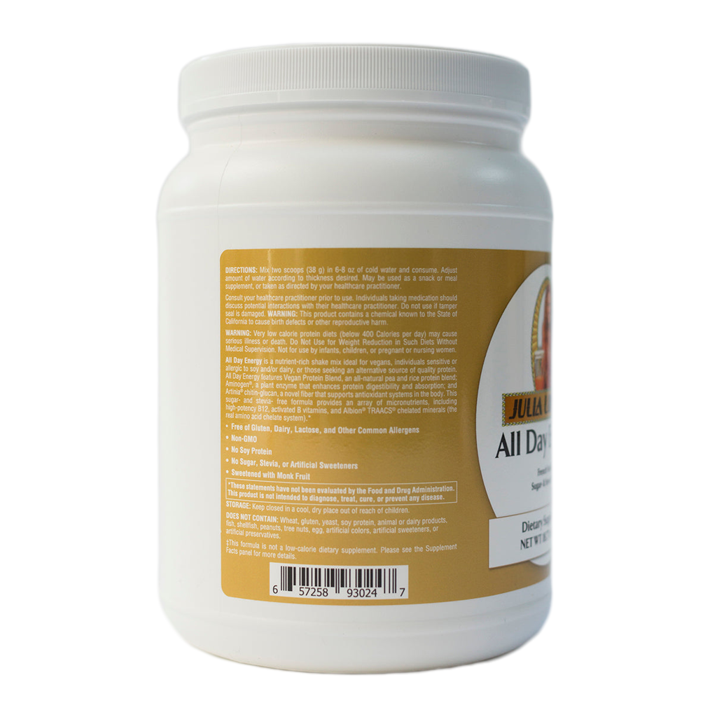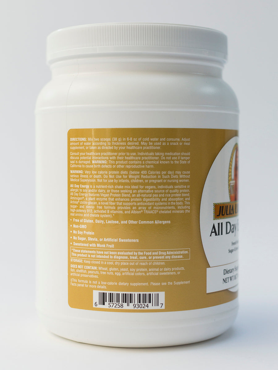 All Day Energy features VegaPro™, an all-natural pea, and rice protein blend; Aminogen®, a plant enzyme that enhances protein digestibility and absorption; and Artinia® chitin-glucan, a novel fiber that supports antioxidant systems in the body. This sugar- and stevia- free formula provides an array of micronutrients, including high-potency B12, activated B vitamins, and Albion® TRAACS® chelated minerals (the real amino acid chelate system).*